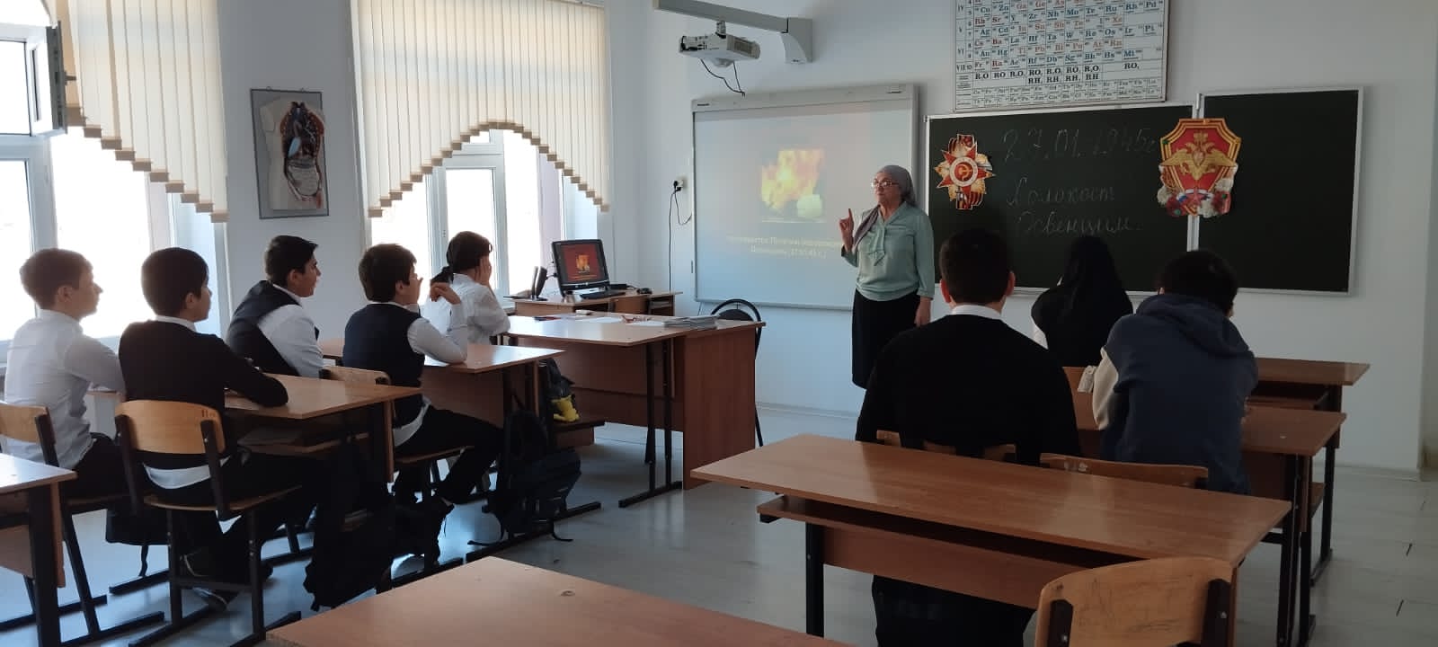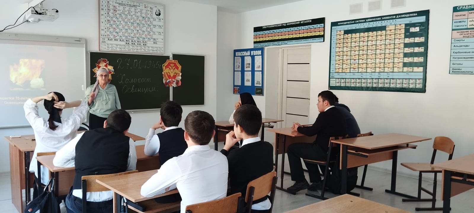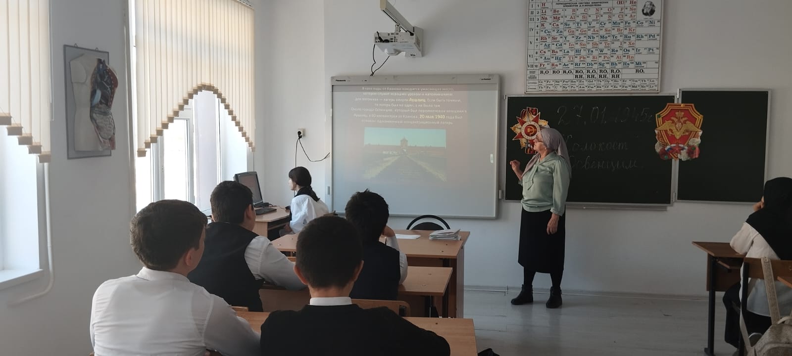 29.01.2024 г. в МБОУ «Ца-Веденская СОШ 1» Аласханова Татьяна Сергеевна провела классный час на тему: «День освобождения нацистского концентрационного лагеря «Освенцим» советскими войсками.