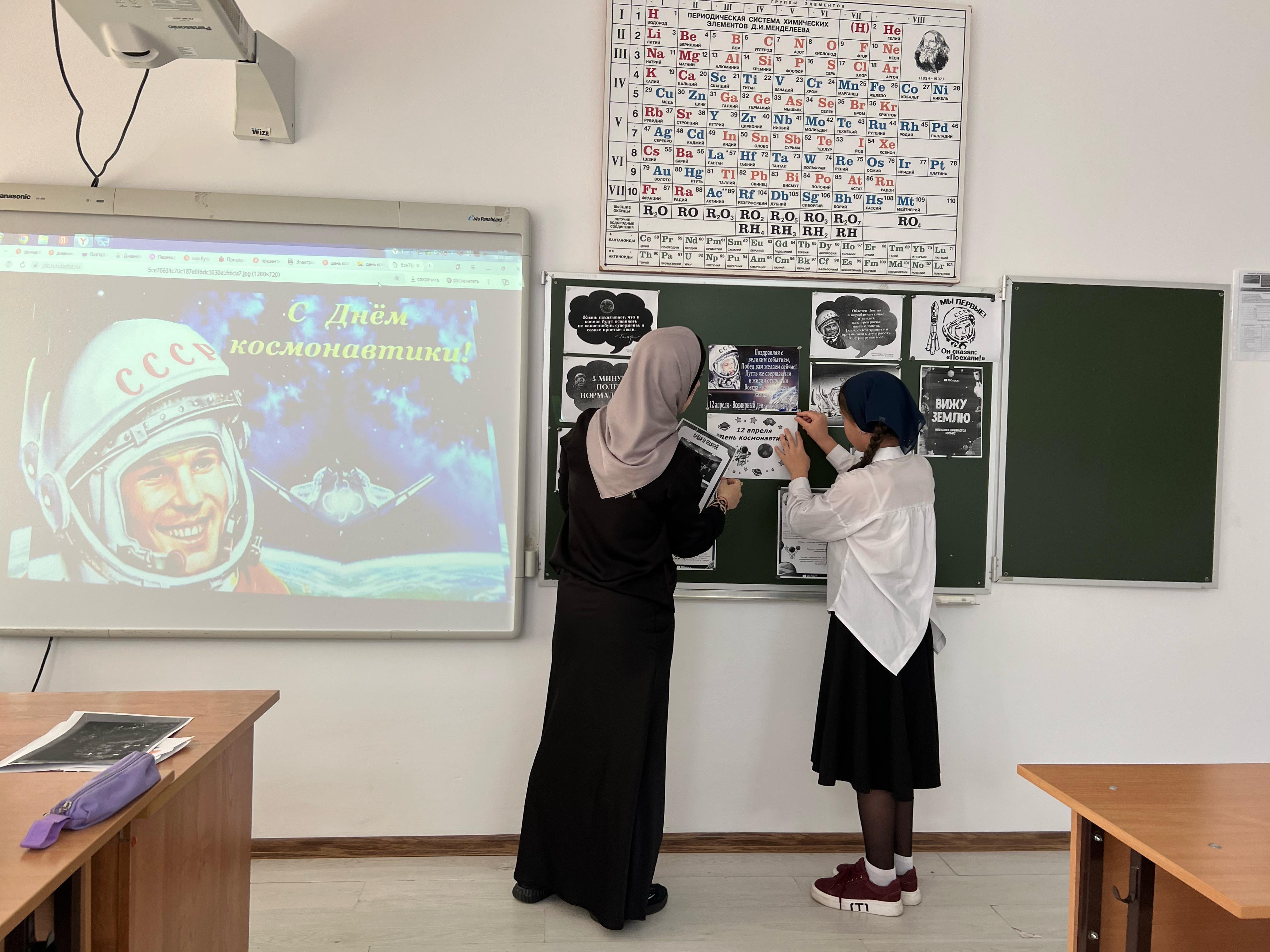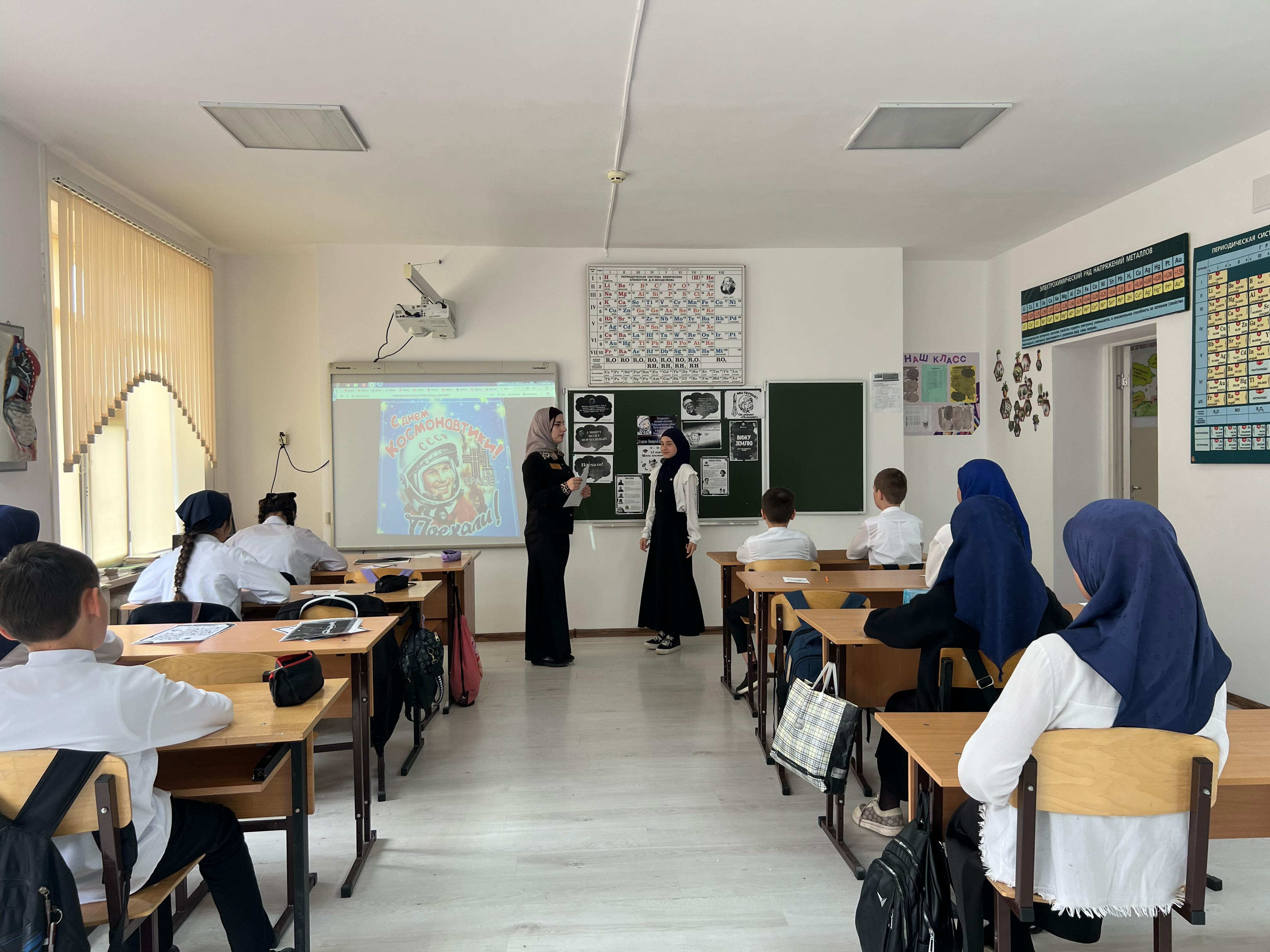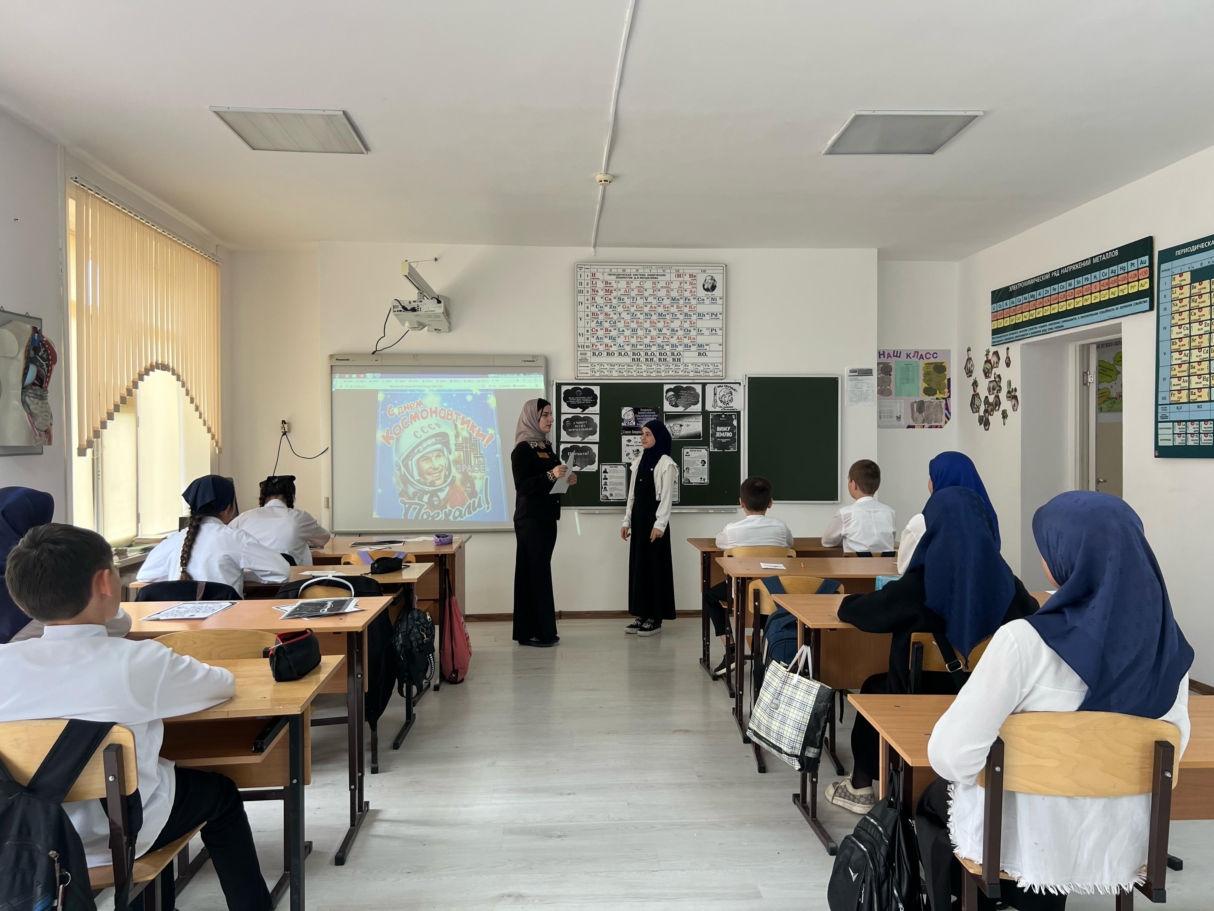 В ходе классного часа Аминат Майрсолтаевна рассказала об истории первого полета человека в космос, о Юрии Гагарине и его подвиге, о значении этого события для всего человечества. Учащиеся узнали о современных достижениях в области космонавтики, о международных космических станциях и перспективах освоения других планет.