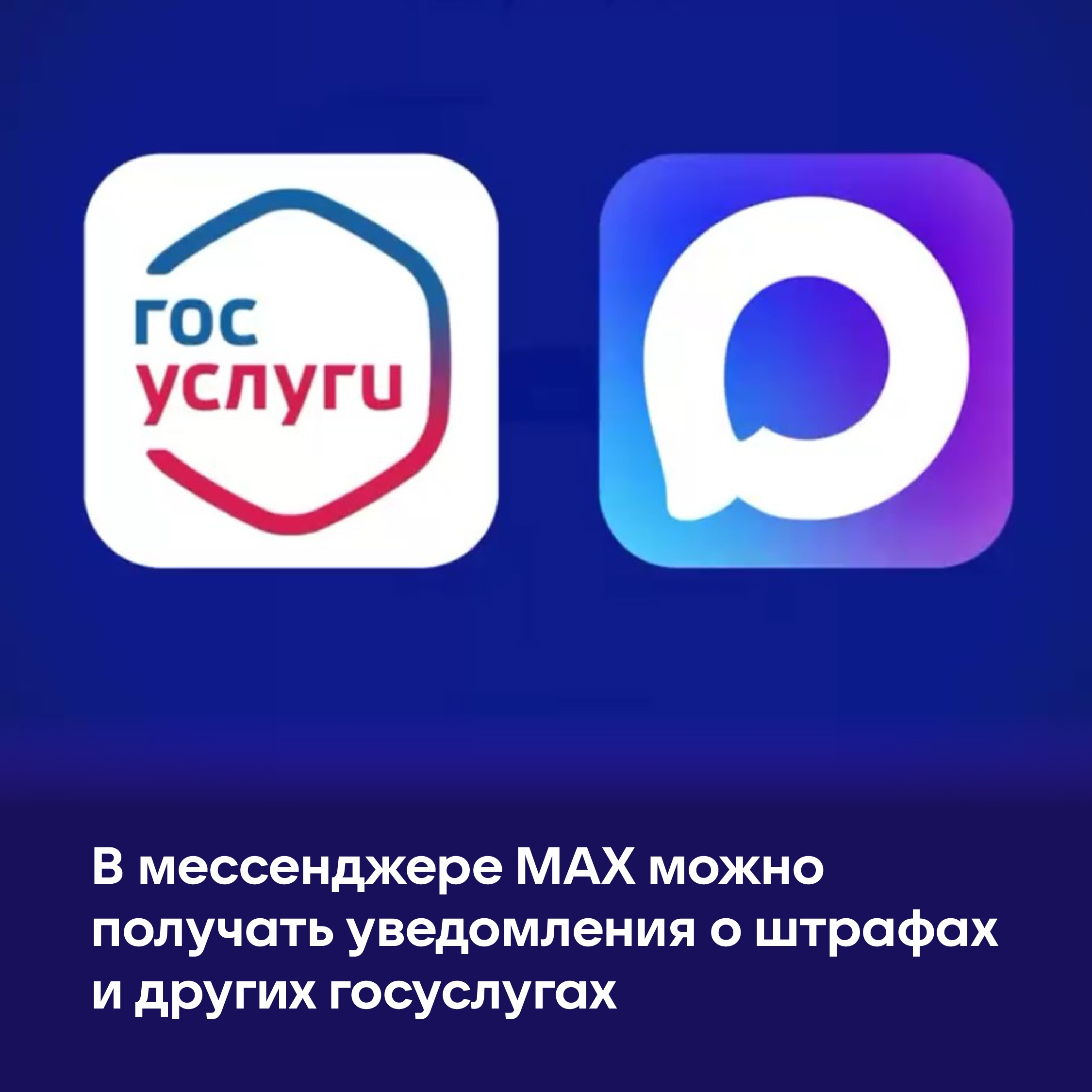 12.01.2026Уведомления о штрафах, квитанции об оплате, статусы заявлений и другие госуслуги теперь доступны в мессенджере MAX. Для этого нужно привязать свой аккаунт в MAX к Госуслугам.Что нужно сделать:Убедитесь, что ваш аккаунт в мессенджере Max и ваш аккаунт на Госуслугах зарегистрированы на один и тот же номер телефона.Зайдите в свой профиль на Госуслугах, найдите раздел «Уведомления» и настройте, какие именно оповещения (о штрафах, заявлениях, записях к врачу) вы хотите получать в MAX.В мессенджере MAX найдите официального чат-бота Госуслуг.Как это работает:Вы будете получать сообщения о новых штрафах, статусах заявлений и записях прямо в чате MAX.Нажав на уведомление о штрафе, вы сможете оплатить его прямо в мессенджере через СБП.Квитанции об оплате также появятся в чат-боте, и их можно будет скачать или отправить.Какие преимущества:Удобство: Уведомления и оплата находятся в одном приложении.Скорость: Быстрое информирование и оплата.Интеграция: Работает с мобильной подписью «Госключ», позволяя подписывать документы.